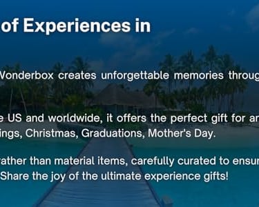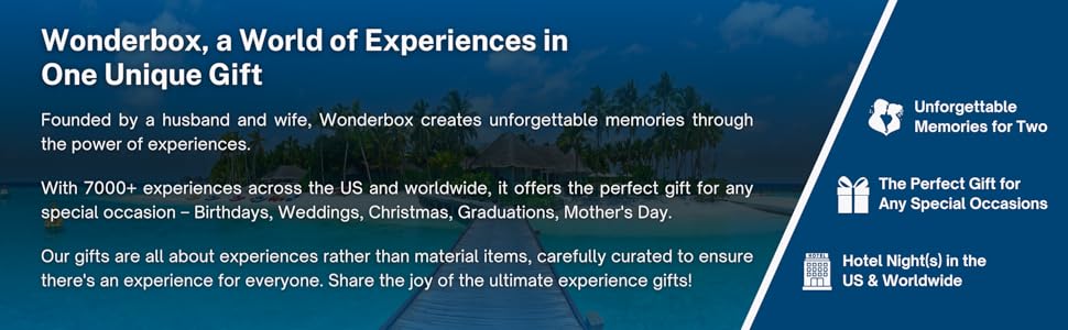 ✅ORIGINAL GIFT IDEA FOR ANY OCCASION : Birthday, Wedding, Graduation, Thanksgiving, Christmas… Wonderbox experience gift it’s the perfect gift to surprise the person you want and offer incredible experiences to create memories All our gifts are experiences to live it up and share, they offer experiences rather than material gift. Gift a large choice of wonderful prepaid experiences in one gift box. 👍 US based company 👍 5000+ experiences in US 👍 4,5 on TrustpilotWrite your text here...