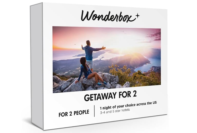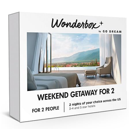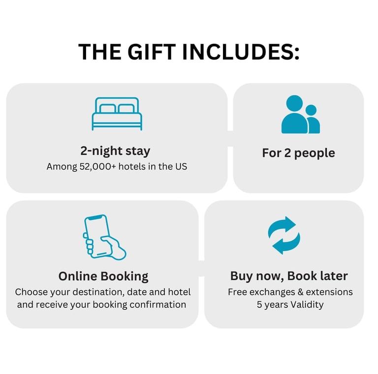 ✅THE GIFT BOX OFFERS a two-nights stay in a 3, 4 or 5* hotel among 52000+ hotels across the US or more worldwide with or without breakfast for 2 people. The prepaid voucher allows for direct booking online to book and choose your stay. Example of hotels included: Hilton Garden In San Francisco, The Luxor in Las Vegas, Hampton Inn near Universal Studio, hotels around National Parks...