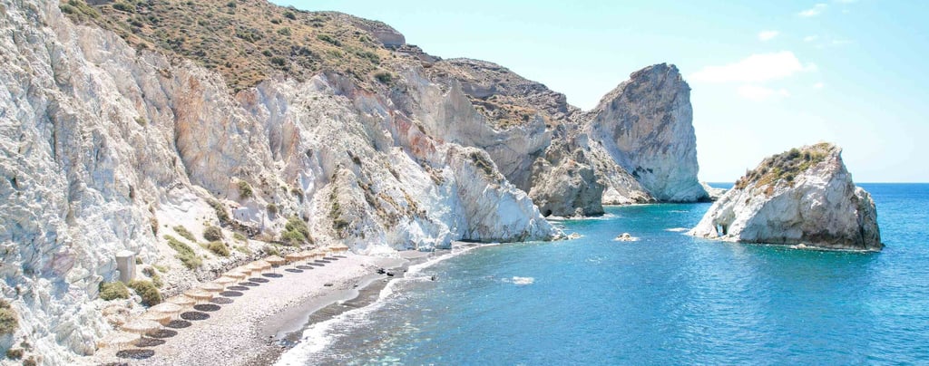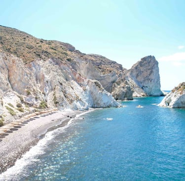 · Tucked along the curve of a natural cove, it boasts calm water and amazing views of the jagged, wonderfully eroded coastline. While you can still rent an umbrella or lounger, there are no hotels in this part of the island, which means it is blissfully free of crowds.