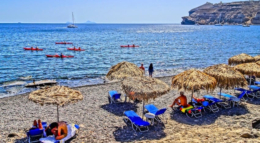 Though technically just a continuation of the shoreline south from Perissa Beach, Perivolos Beach is a destination in its own right. Its claim to fame is that it’s one of the best beaches Santorini has for music and nightlife.