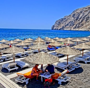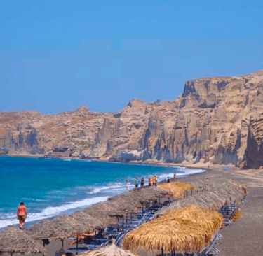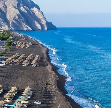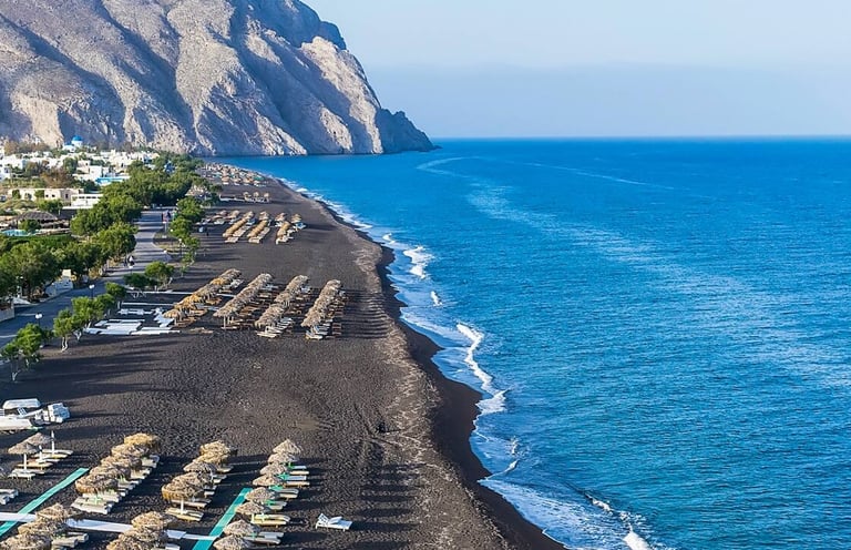 o Black Beach (Perissa) → Black sand and beach bars.