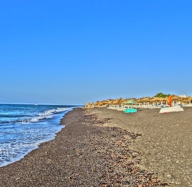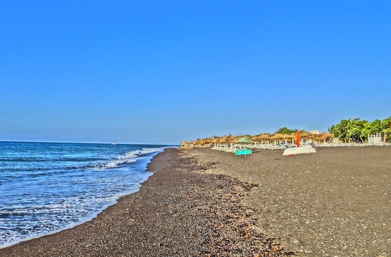 Similar to Perissa, with black volcanic sand, but more family-friendly.