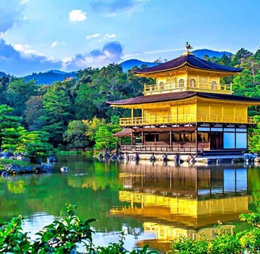 Kinkaku-ji: Visualize the shimmering r reflection of the Golden Pavilion on the tranquil pond.